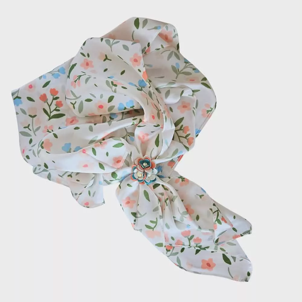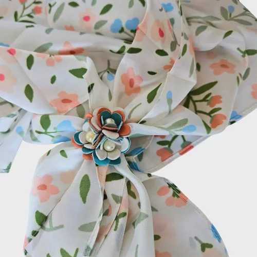 Egy különleges páros: 100% selyem kendő + kézzel készült virág gyűrű. Elegáns, nőies és kreatív – ráadásul többféleképpen variálható a mindennapokban.