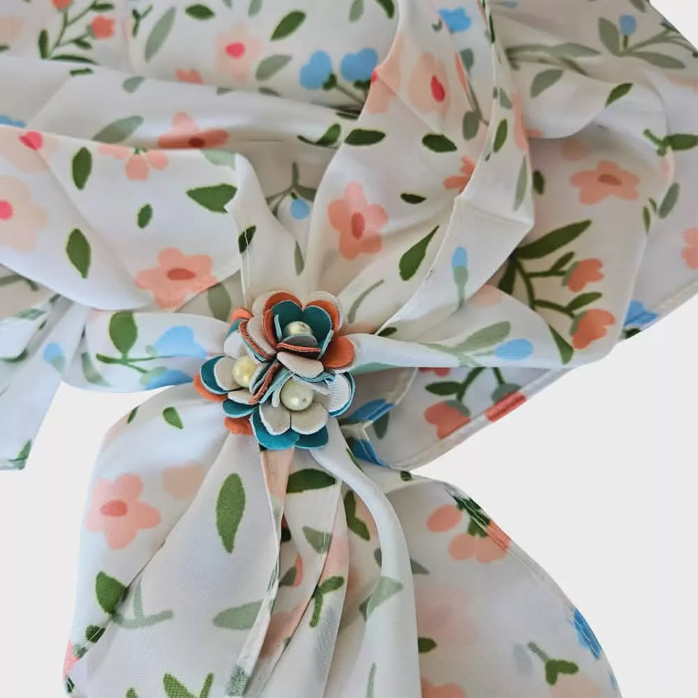 A finom tapintású, olasz tervezésű selyem kendő harmonikus színeivel és mintájával azonnal feldobja a szettedet. A hozzá tartozó bőr virág gyűrű egyszerre ékszer és praktikus kiegészítő: a kendő megkötésére is használhatod. A gyűrű alapja állítható, így kényelmesen illeszkedik.